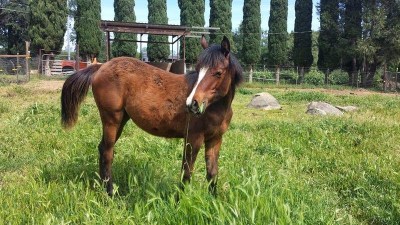 On the evening of April 23rd, 2014, nearly 6 months after I first saw her picture under For Sale on a Facebook page, a scrappy 8 month old bay filly stepped off of a shiny transport trailer at the end of our driveway. 3 days previously she had followed a stranger and a bucket of grain onto the first trailer she’d ever set hoof on, in Eastern Nebraska; 1500 miles later she disembarked to an eager redhead, hollering kin, and a whole lot of green.