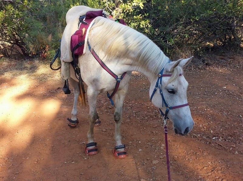 I’ve been toodling around the neighborhood on Scrappy in the Sensation treeless with Skito pad off and on lately and this morning I seized the opportunity to get a few more hilly miles in at the lake. Of course it was also the hottest day of the week (at least I hope it was..) and even though we got our workout in quite quickly for our turtle selves, it was just plain HOT when we got back to the trailer. Fortunately there are a few key water troughs out on the Lake Oroville trails and even when they have the *nerve* to re-cement them in a startling new fashion, Scrappy can be convinced to drink from them.