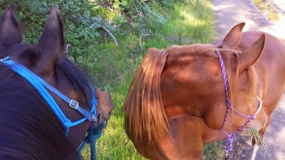 I wasn’t quite talented enough to manage photos or film of the half hour we took to cross the stream halfway through. Sheza has done minimal water crossings and tip toes around puddles like they’re acid, so I knew a stream crossing would be worth doing. At first I turned her loose and rode across the stream, just to see what she’d do. It’s wide and safe and I know she’s too needy to run off alone, which was all true, but she didn’t deign to even put a toe in. Blaze and I meandered back across the stream, hooked her up, and then he stood patiently in the water for about 15 minutes while she gradually eased her way into the water, sometimes giving me just *intent* of moving forward which I vigorously rewarded. She tried a few dramatic pull backs at the water’s edge before actually getting a toe wet but she’s so aware that EH-EH-NO! means NO, she would come back forward immediately and get closer in yet when she heard it. Sure enough 20 minutes in she calmly had her front hooves in and was snuffling the water. She did one good little hop up out of the water on the full crossing but then was convinced to stand and lick and chew, and I felt no need to belabour the point considering her age and experience.