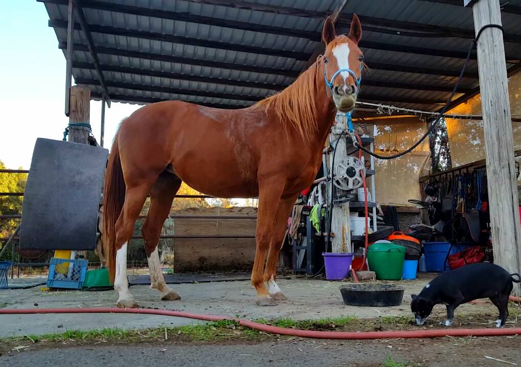 Briefly: a round of Dreamhorse/CL advertisement prompted immediate response from a friend recommending a potential great home for Scrappy and said home saw the ad independently and also contacted me. I set up to meet D Wednesday morning at the lake trails for her to try Scrappy out and pulled Scrappy Tuesday afternoon to wash his tail, be sure his hooves were as tidy as I wanted, and give him a mash. He was his usual stoic cooperative self.