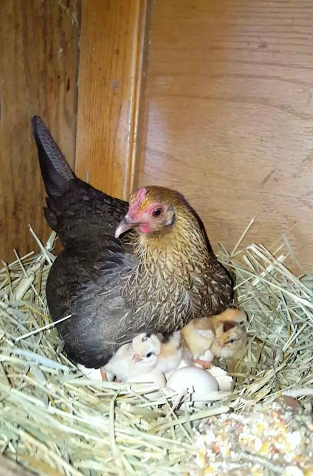 We have 9 young bantams a friend gifted to us this summer, 5 roosters unfortunately, but among the few and barely laying hens, there’s a broody hen. As of yesterday, as Funder said–broody hen is a teen mom! A quite industrious one I must say, to the tune of 8 chicks in the last 24 hours. In November no less.