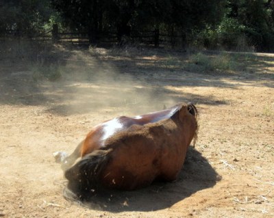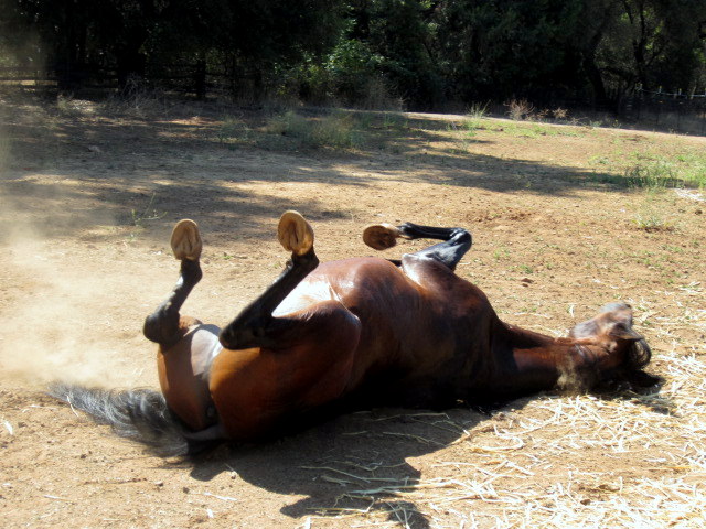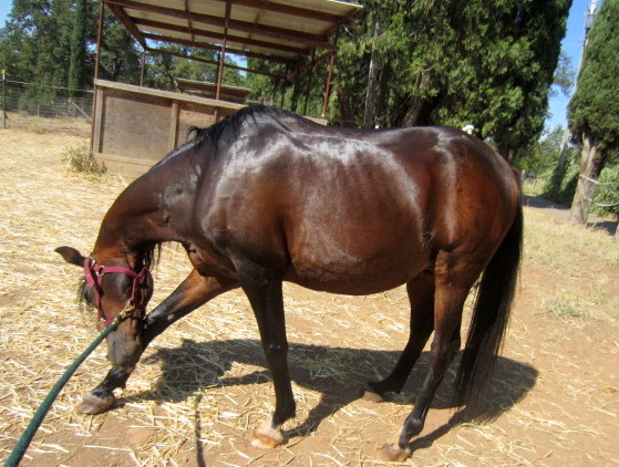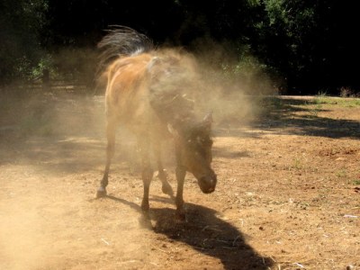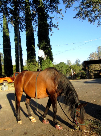 This morning it was Sheza’s turn for a thorough grooming and hoof trim. I swear to you all, she is Dr. Jekyll & Mr. Hyde in red filly form. True to character she jammed her head excitedly in the halter (she currently prefers wearing Blaze’s faded old green one), then pranced and pirouetted and snorted her way over to the cross ties, half remembering sometimes that there was a person attached to the lead line. On the way I made her pay attention, sort of, we backed and circled and moved around and rolled the whites of our eyes at each other until she was relatively polite to lead, and I do mean relatively. Once in the cross ties she promptly began pawing the ground obnoxiously, and as I began working on her feet, she gave her customary One Big Spazz. If I recall we didn’t have any Spazzes the last few trims but the weather this morning is deliciously cool and well: Sheza- brat. The Big Spazz consists of surging forward dramatically, half rearing, throwing herself backwards while pulling back and thrashing like a fish, and then stopping to stand quietly, licking and chewing. After Big Spazz she is usually completely quiet and polite to have her feet done, as she was today. Mr. Hyde gets haltered and Dr. Jekyll sweetly nibbles my neck while I roll her toes…