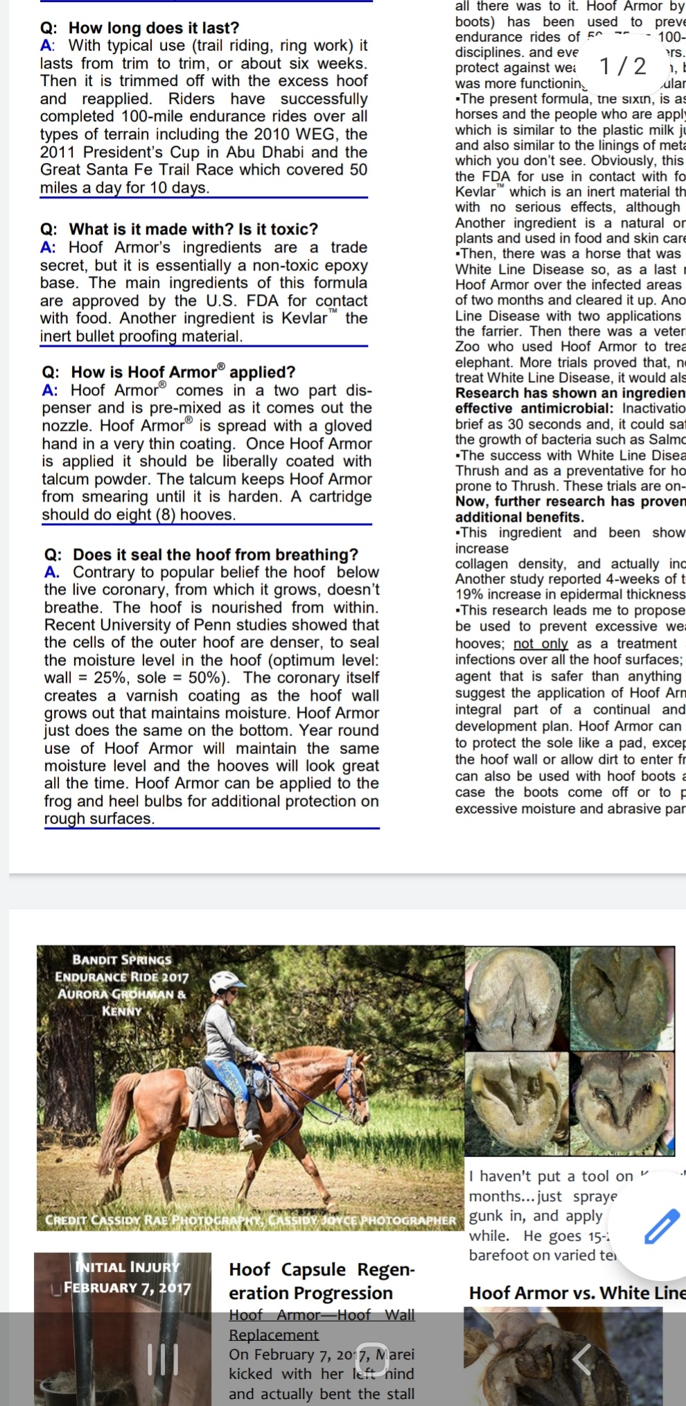“Hoof Armor consists of only three ingredients: an epoxy base, Kevlar and a natural antimicrobial. Kevlar pulp is added for added strength, cohesion and thixotropic properties. The natural deritive in Hoof Armor acts as a cure accelerator as well as an anti-microbial. This ingredient has been found to increase collagen elasticity and increase dermal thickness. This is my sixth formula improvement in 18 years of making Hoof Armor.”
